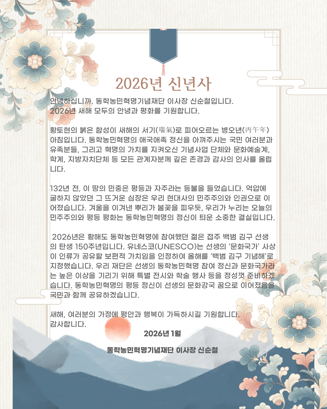 동학농민혁명기념재단 ㅣ 사업자정보확인 404-82-08587 ㅣ 통신판매업신고 2023-전북정읍-0046호