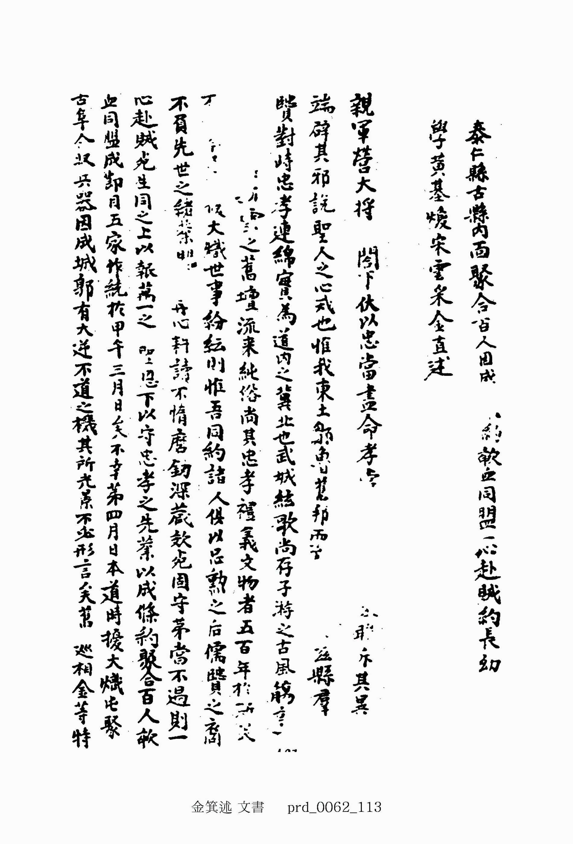 心赴賊死生同之上以報萬一之 聖恩下以守忠孝之先業以成條約聚合百人歃