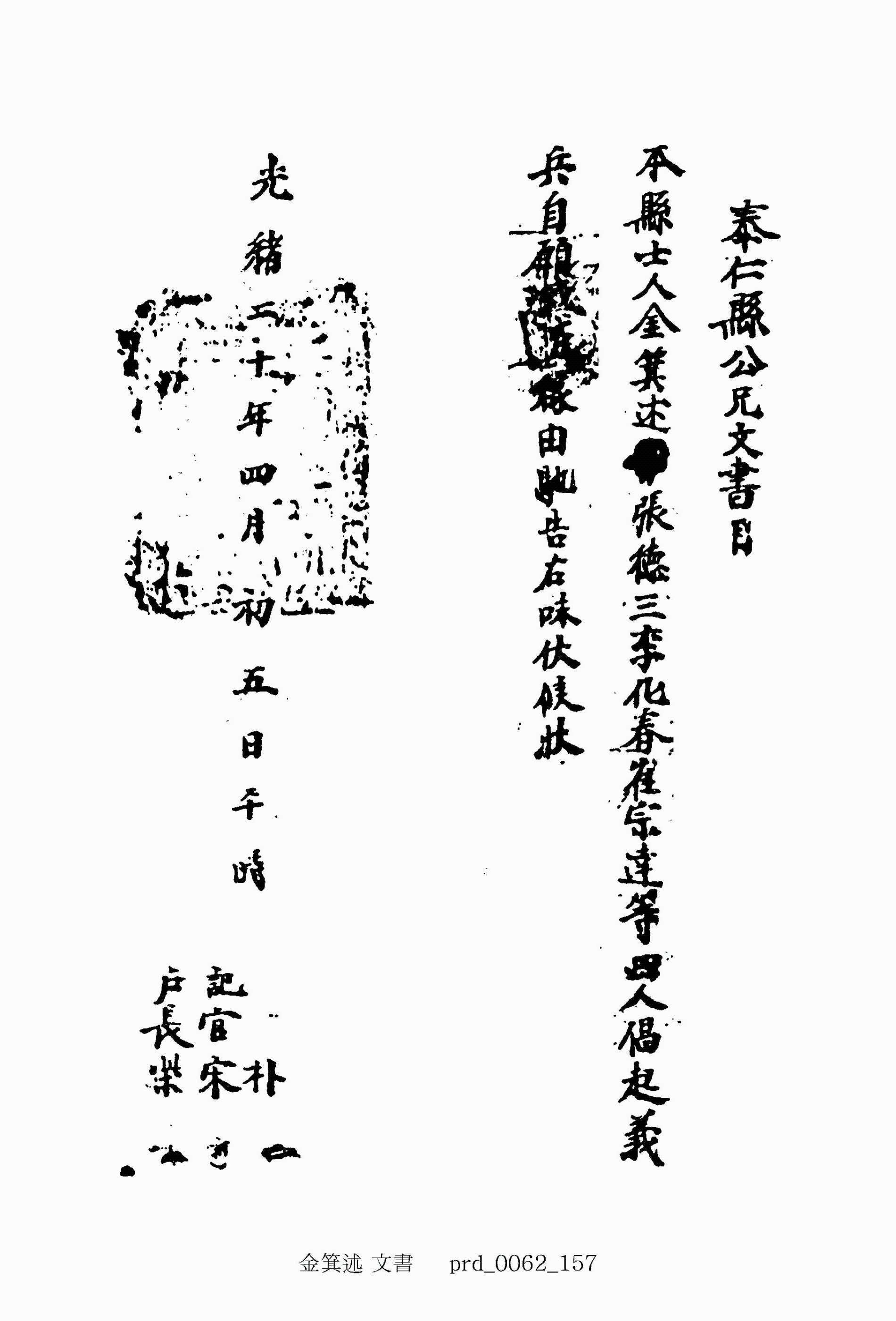 本縣士人金箕述張德三李化春崔宗達等四人倡起義 兵自願滅賊緣由馳告右味伏候狀 光緖二十年四月初五日午時 朴 記官宋 戶長柴