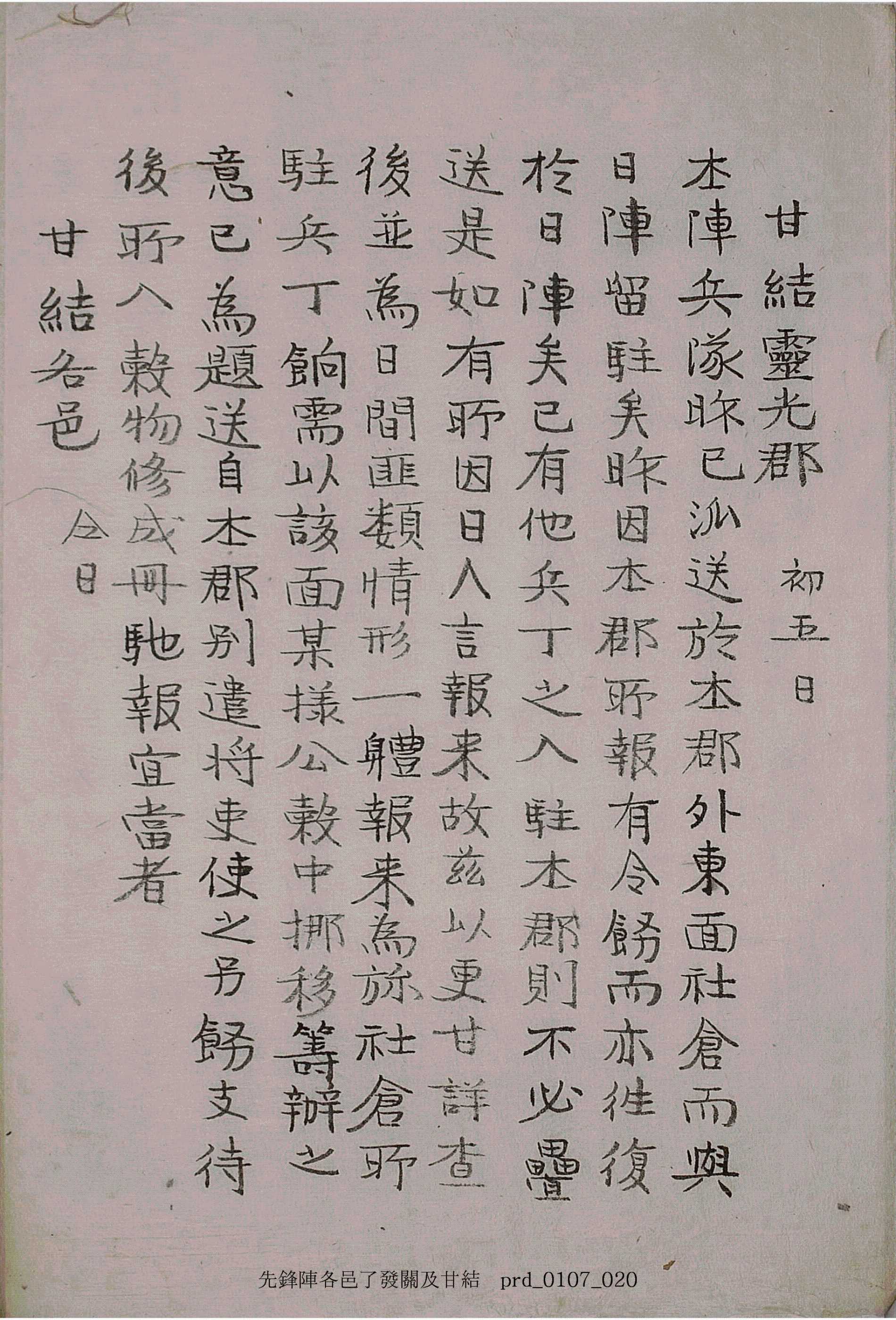 甘結靈光郡 本陣兵隊昨已派送於本郡外東面社倉而與 日陣留駐矣昨因本郡所報有令飭而亦往復 於日陣矣已有他兵丁之入駐本郡則不必疊 送是如有所因日人言報來故玆以更甘詳査 後竝爲日間匪類情形一體報來爲旀社倉所 駐兵丁餉需以該面某樣公穀中挪移籌辦之 意已爲題送自本郡別遣將吏使之另飭支待 後所入穀物修成冊馳報宜當者