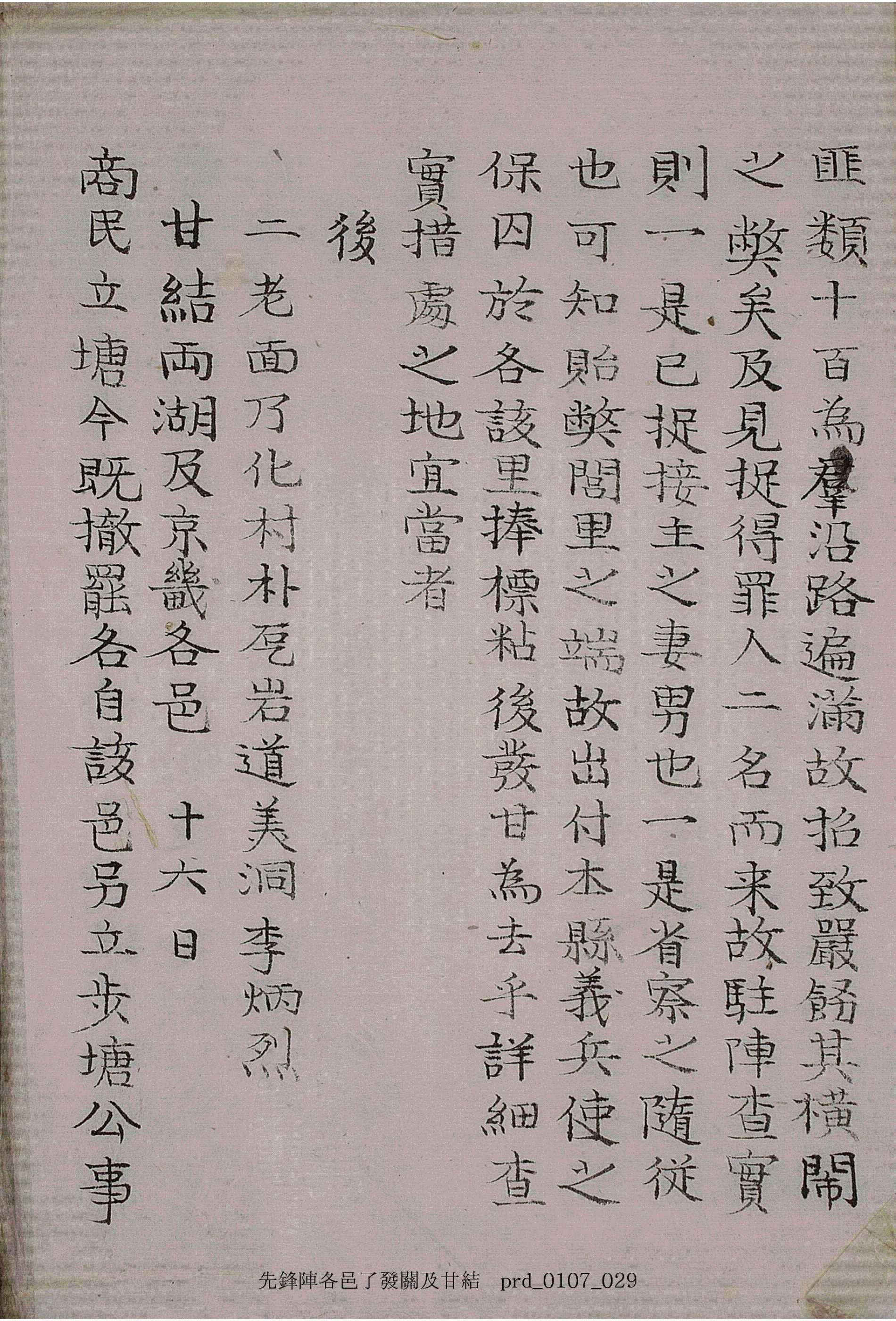 甘結兩湖及京畿各邑 商民立塘今旣撤罷各自該邑另立步塘公事 替傳之際必塡到付日時次次傳送俾無咎刻 暫滯之弊而到付過去日時這這馳報以爲考 勤慢措處之地爲旀至於商民等段嚴沍三朔 立塘擧行誠極嘉尙自各其地方另加顧護宜 當者