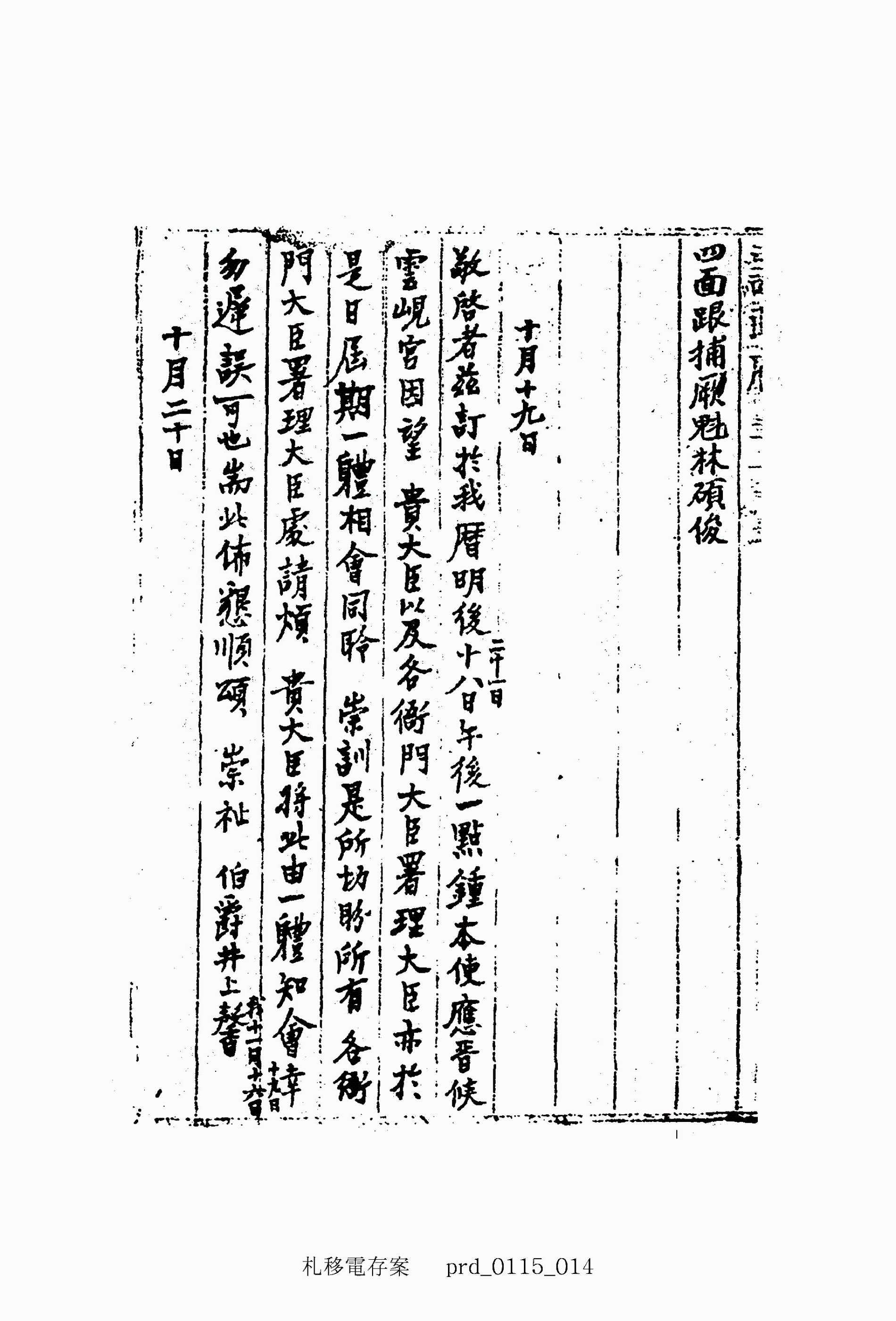 營奉 上諭日兵以東徒剿滅事下去而由我調兵甚 是不安所經各邑接濟策應之節別般另飭事政府 敬复者昨奉 函示爲 貴曆十八日午後一點鐘派岡本君晉候 雲峴宮因望各衙門大臣相會等語閱悉一是本大臣業經知會各 衙門大臣署理大臣處擬於是日屆刻同赴肅此佈复順頌 崇祉 再啓者玆遵 來示將昨夜送到 台諭以 貴十八日晉候 雲峴宮事原函順便繳呈卽希 査收爲幸