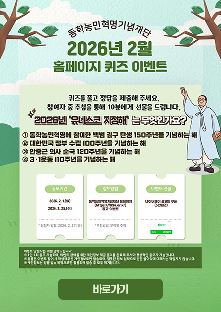 상호:동학농민혁명기념재단 대표:신순철 ㅣ 사업자정보확인 404-82-08587 ㅣ 통신판매업신고 2023-전북특별자치도정읍-0046호
