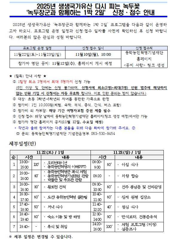2025년 생생국가유산 다시 피는 녹두꽃 ‘녹두장군과 함께하는 1박 2일’ 신청·접수 안내 공지