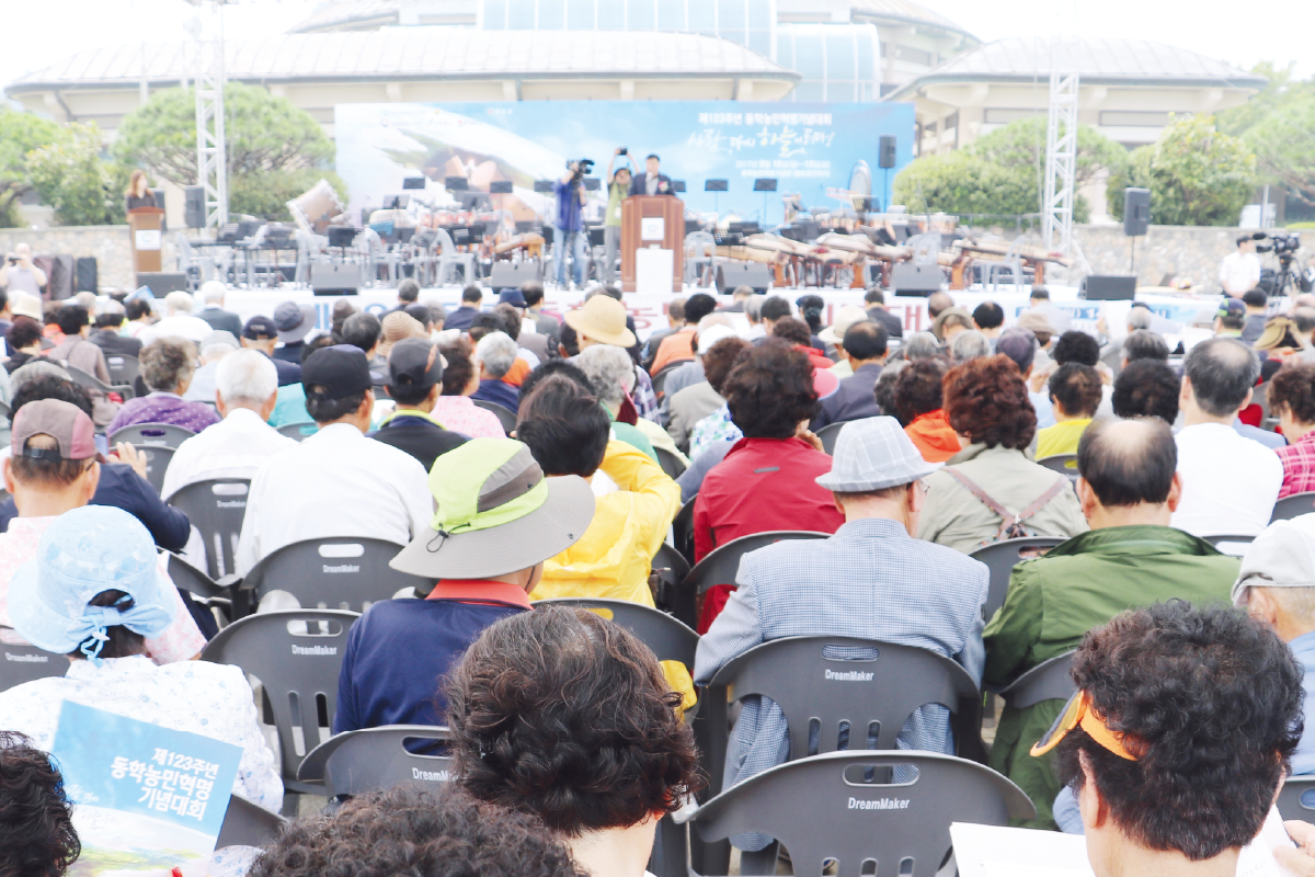 지난 9월 18일과 19일 이틀간 동학농민군 최초 전승지인 황토현전적지에서 제123주년 동학농민혁명기념대회가 펼쳐졌다. 이날 대회에는 송하진 전라북도지사, 김생기 정읍시장, 장학수·최은희 전북도의회 문화건설안전위원회 부위원장, 김춘진 더불어민주당 전북도당위원장, 유진섭 정읍시의회 의장, 안길만 정읍시의회 경제건설위원장을 비롯하여 동학농민혁명 참여자 유족, 천도교인, 전국 기념사업단체 대표자 등 700여 명이 참가하여 성황을 이루었다. 이틀간에 걸쳐 펼쳐진 기념대회는 18일 오후 2시부터 ‘동학농민혁명과 한국 근현대사’라는 주제의 학술대회와 함께 역사체험 프로그램 및 문화공연이 펼쳐졌고, 19일에는 길놀이를 시작으로 제123주년 기념식, 특별공연, 오찬 순으로 진행되었다. 기념식에서는 동학농민혁명 정신선양사업의 확산을 위해 기념재단에서 추진한 동학농민혁명 주제 스토리텔링 공모전에서 입상한 작품에 대한 시상식이 있었다, 수상은 대상에 김진영(갑오백성, 연극 시나리오), 최우수상에 문수진(뮤지컬 대본), 우수상에 이원희(연극 시나리오) 씨가 각각 수상하였다. 또한 동학농민혁명 정신선양사업에 기여한 사람에게 공로패가 수여되었다. 공로패는 함기영(동학농민혁명유족회 이사), 채길순(명지전문대 교수), 진윤식(고창동학농민혁명기념사업회 부이사장) 수상하였다. 한편, 동학농민혁명유족회 이기곤 이사장은 동학농민혁명 가치를 높이고 그 정신 계승·발전에 기여한 김생기 정읍시장에게 30여만 유족을 대표하여 감사패를 전달하였다.
