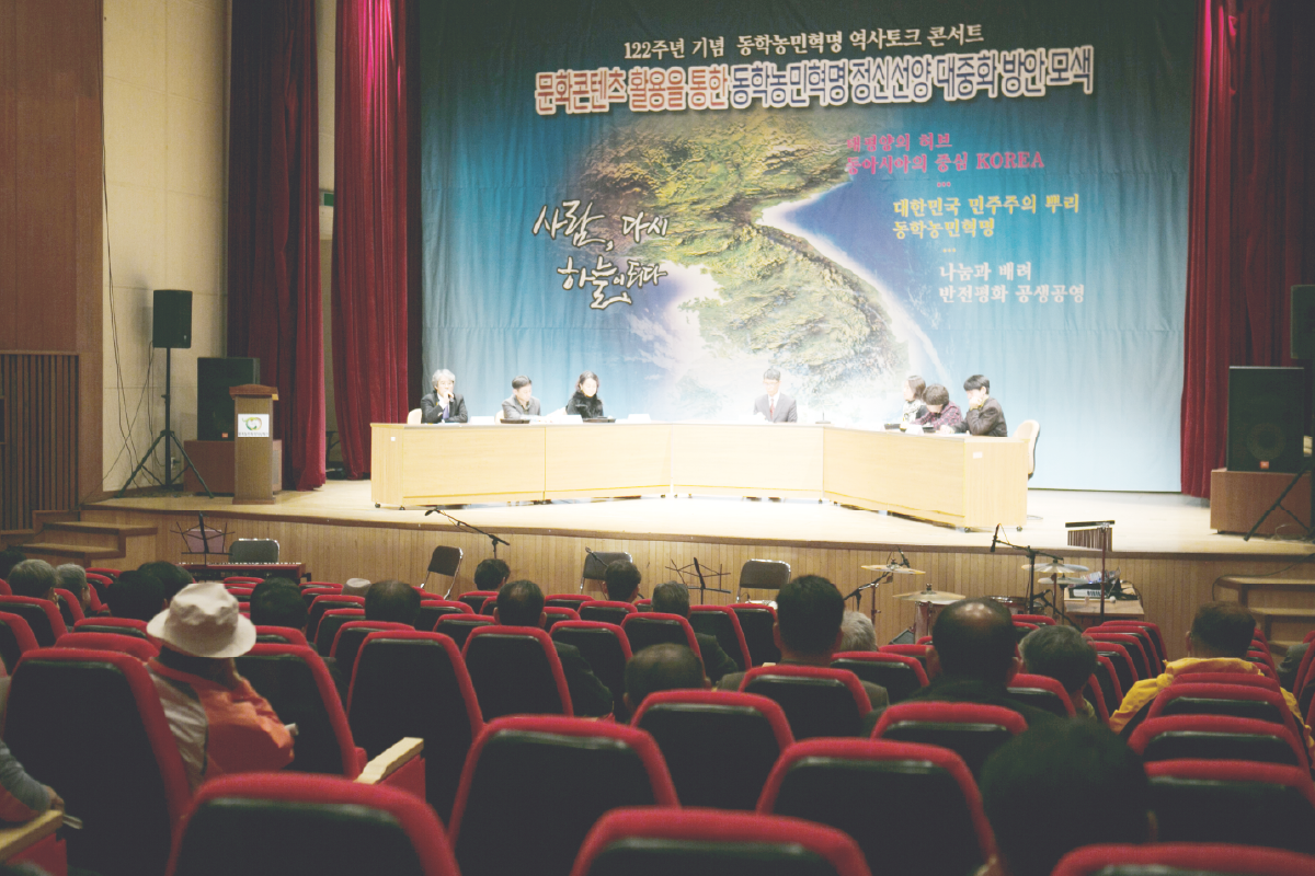 11월 19일(토) 동학농민혁명교육관 대강당에서 [동학농민혁명 역사토크 콘서트]를 개최하였다. 역사토크 콘서트는「문화콘텐츠 활용을 통한 동학농민혁명 정신선양 대중화 방안 모색」이라는 주제로 열렸으며, 정읍시장 및 정읍시의회 의장 등 내외귀빈 100여 명이 참석하였다. 동학농민혁명 연구자, 문화예술가, 문화콘텐츠 전공연구자의 토론과 동학농민혁명을 모티브로 한 문화공연 등이 진행되었다.