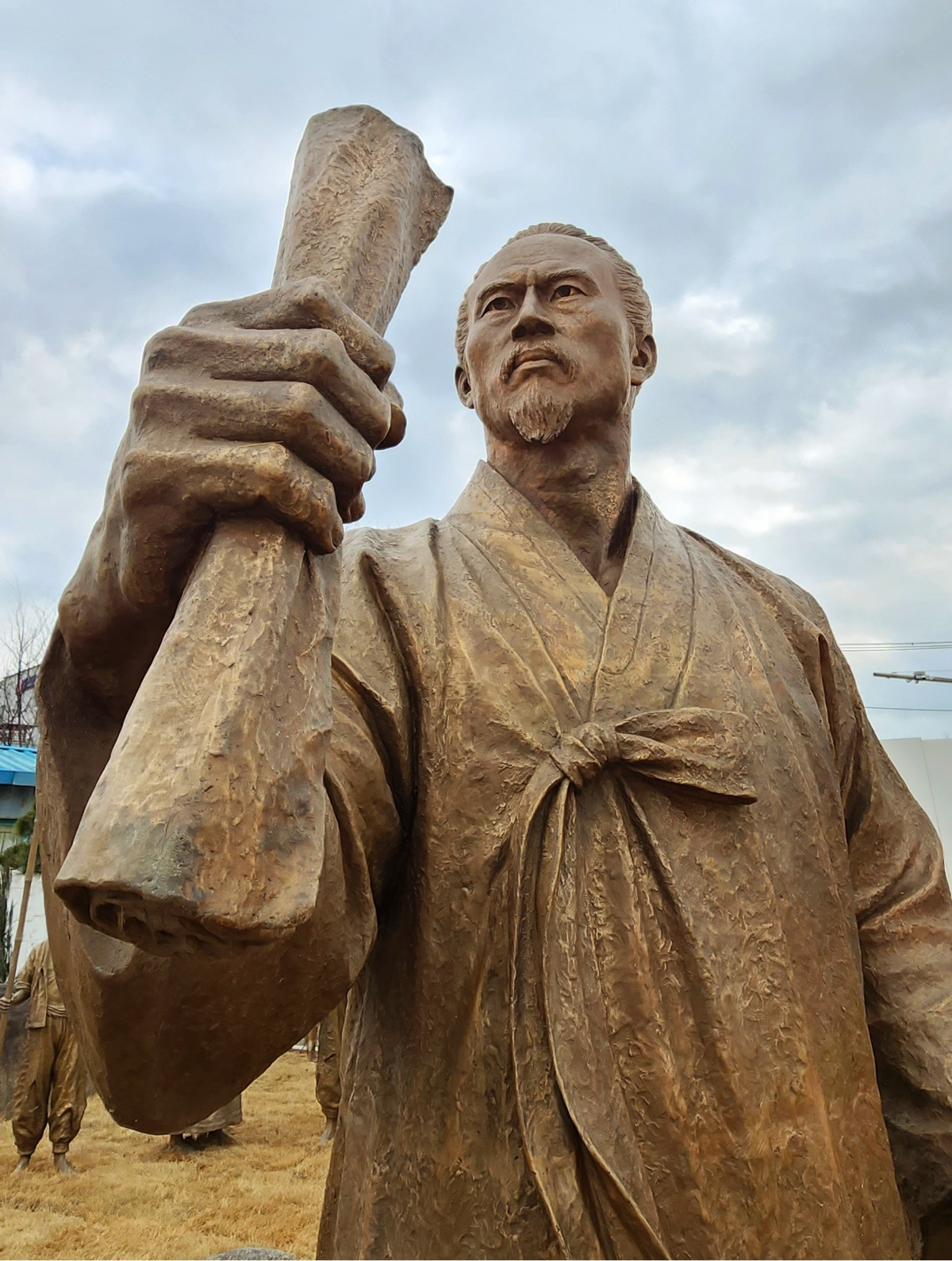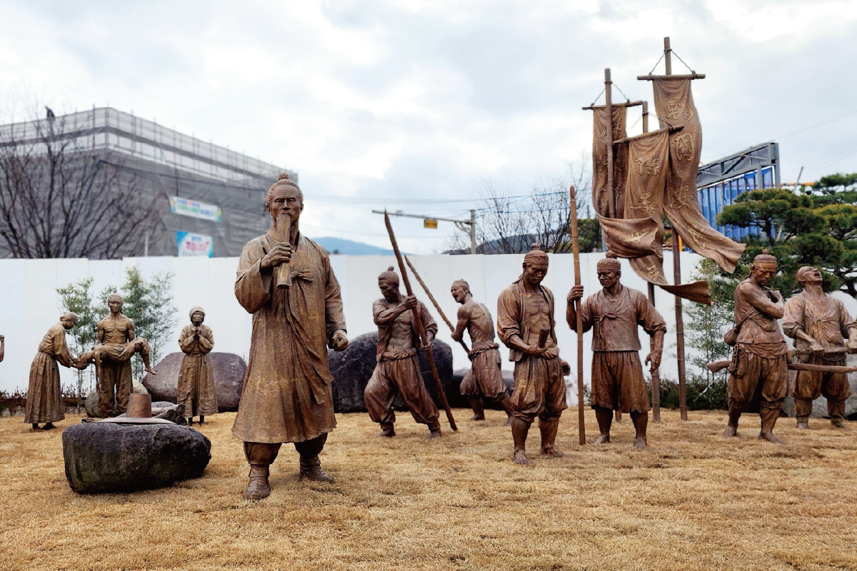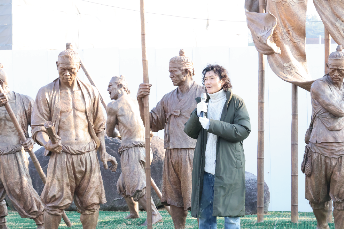 답) 네, 1894년 동학농민혁명 당시의 현장감을 살리기 위해 조형물을 맨발로 흙 위에 서 있게 하였습니다. 그리고 조형물 주변에 자연석을 배치했습니다. 관람자들에게 당시 농민들의 어려웠던 삶을 보여주는 동시에 봉기할 수밖에 없었던 시대적인 상황을 보여주고 싶었습니다.