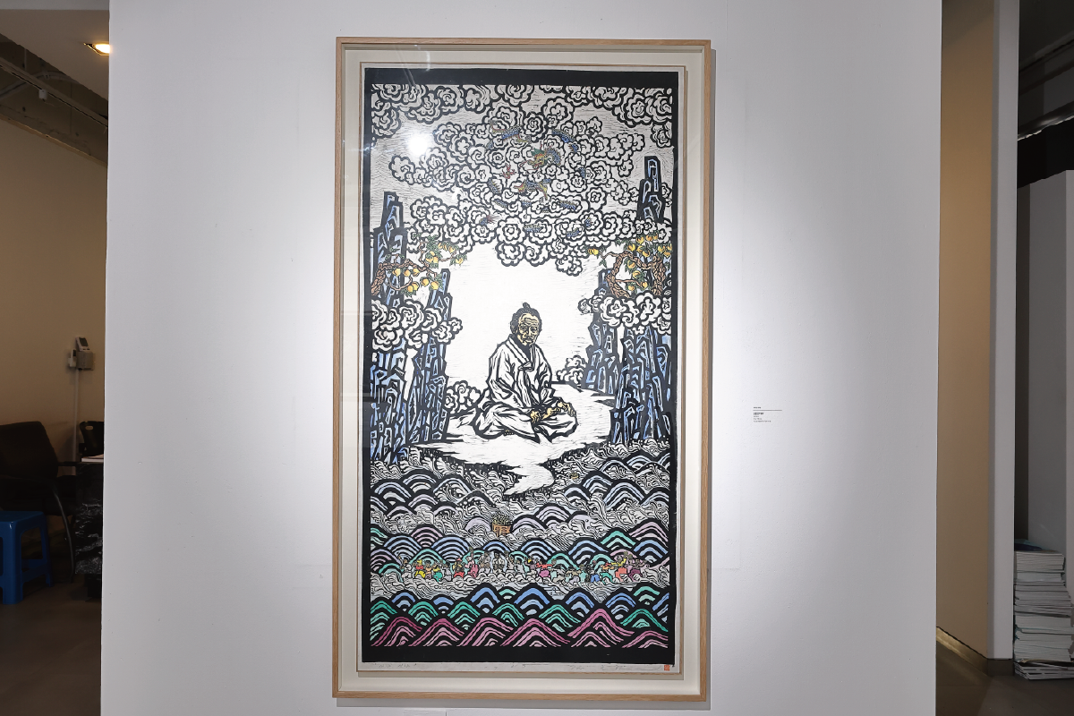 김준권, 새야 새야, 목판 채색(91×78㎝), 1987                                                                 서지연, Anima Mundi 2024 shaman king 이소사, 설치영상, 2024