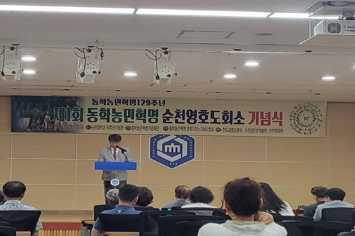 지난 7월 7일 전남 순천시 소재 순천대학교 70주년기념관에서 동학농민혁명 영호도회소 기념사업회(대표 이하윤) 주최로 ‘제1회 순천영호도회소 기념식’이 열렸다. 동학농민혁명 129년을 기념하고, 영호도회소의 역사적 의미를 기리기 위해 마련된 이날 행사에는 주용덕 천도교 종무원장, 강성호 순천대 인문학술원장을 비롯하여 전국에서 활동하고 있는 동학농민혁명 기념사업단체 관계자 등이 참석하였다.