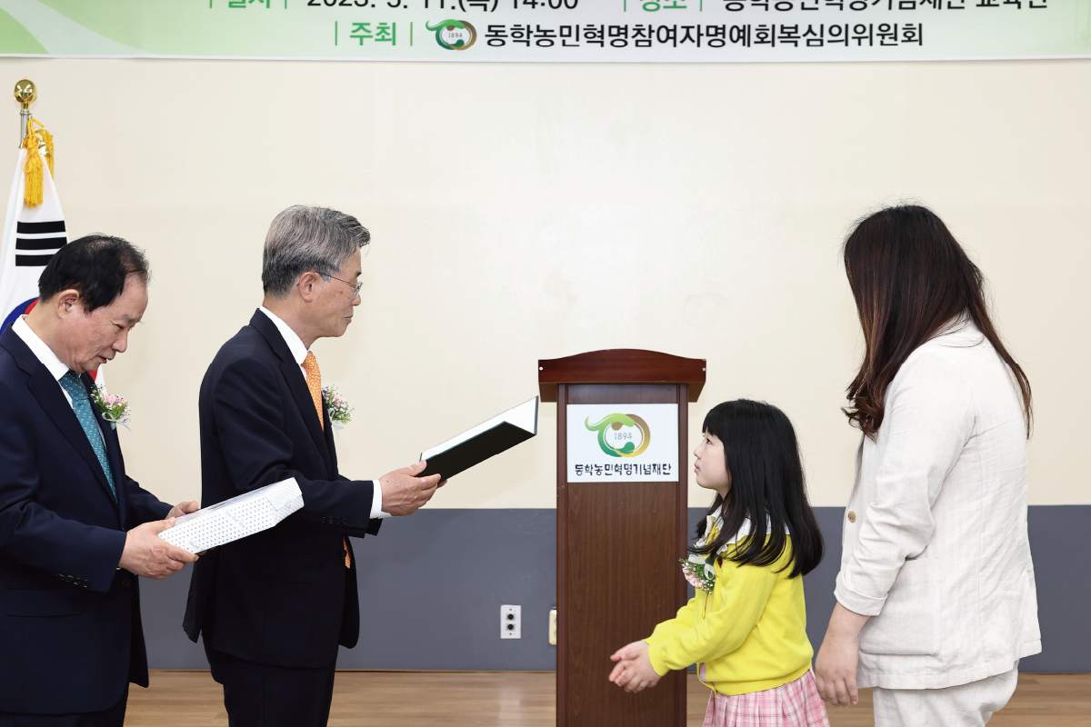 지난 5월 11일 동학농민혁명재단 교육관에서 동학농민혁명 참여자 유족통지서 전달식이 열렸다. 2023년 상반기 심의위원회를 통해 새롭게 등록된 유족을 축하하고 예우하는 차원에서 마련된 이날 전달식은 국민의례, 경과보고에 이어 신순철 동학농민혁명참여자명예회복심의위원회 위원장의 인사말, 주영채 (사)동학농민혁명유족회 이사장의 축사, 유족등록통지서 전달(김홍창 외 9명), 기념 촬영 순으로 진행되었다. 한편 2004년 9월 설치되었던 동학농민혁명참여자명예회복심의위원회 때부터 지금까지(2023. 5. 11.) 등록된 동학농민혁명 참여자는 모두 3,745명이고, 참여자 유족은 12,962명이다.