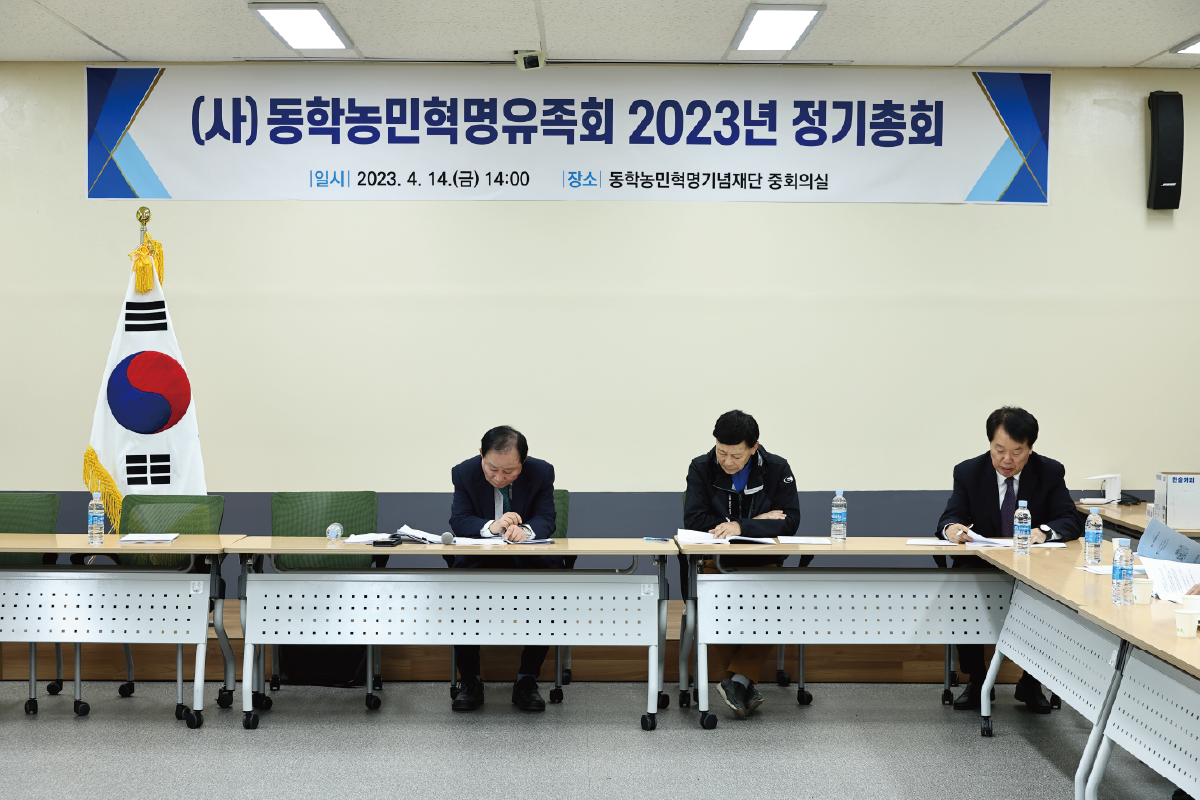 지난 4월 14일 동학농민혁명기념재단 회의실에서 (사)동학농민혁명혁명유족회 2023년 정기 대의원 총회가 열렸다. 이날 회의는 성원보고에 이어 주영채 (사)동학농민혁명유족회 이사장의 개회사로 시작되었다. 본 회의는 2022년도 동학농민혁명유족회 사업 및 예산결산, 감사보고가 있었으며, 2023년 사업계획 및 예산안 심의, 정관 개정안 심의, 차기 임원 선임 및 대의원 선임의 건을 심의․의결하였다. 한편, 이날 회의에서는 ‘동학농민혁명참여자 등의 명예회복에 관한 특별법 일부 개정법률안’(대표발의 : 윤준병 국회의원)이 보고안건으로 상정되어 다양한 의견이 개진되었다.