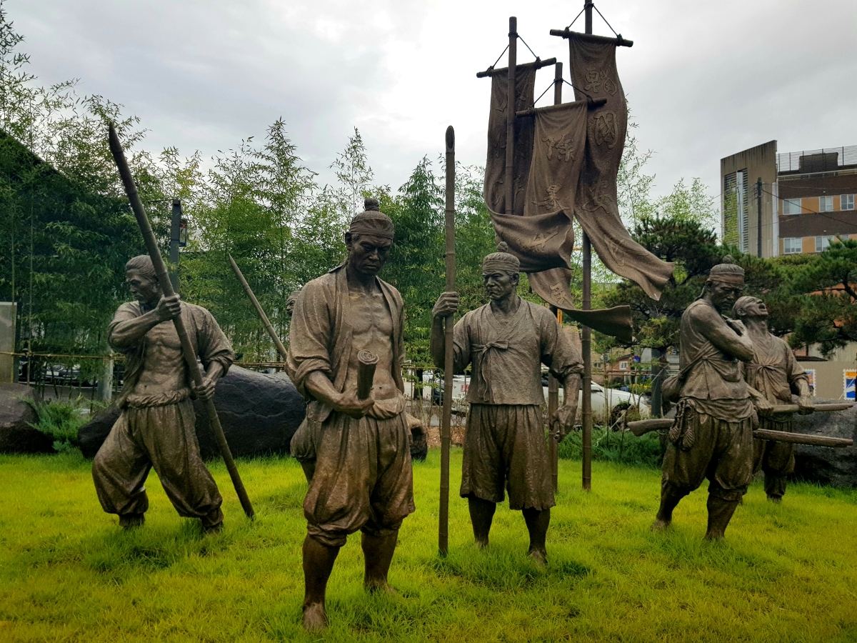 답) 그동안 설치된 대부분의 조형물이 동학농민군의 행렬이나 관군, 일본군, 농민군들이 대치한 전투 장면 등 외적인 모습을 다루었습니다. 하지만 저는 이번 작품을 통해 의연한 전봉준 장군의 모습, 결의하는 농민군 한 사람 한 사람의 표정, 처절한 삶 속에서도 염원을 잃지 않는 민초(民草)들의 얼굴 등등 섬세한 인간의 내면을 담아내려고 노력했습니다. 동상을 잠시 보고 지나치는 것이 아니라 보고 또 보면서 동학농민혁명의 정신을 생각하게 만들고 싶었습니다. 작품에 대해 개괄적으로 설명드리자면 ‘의의 깃발 아래’는 전체 12인 군상으로 이루어진 조형물입니다. 먼저 선두에 전봉준 장군이 장엄한 목소리로 무장포고문을 선포한 후 포고문을 높이 올린 모습을 배치하였습니다. 어떤 것에도 흔들리지 않는 의연한 자세로 앞을 향하는 모습을 긴장감 있게 표현했습니다. 그 옆에 보국안민(輔國安民), 제폭구민(除暴救民), 척왜양창의(斥倭洋倡義)가 새겨진 의로운 깃발 아래서 거사(擧事)를 앞둔 동학농민군을 배치하였습니다. 이분들의 모습은 비장함과 용맹함을 표현하면서도 한편으로 분노, 갈등, 연민, 복수심, 두려움 등의 삶의 다양한 감정을 담아 각자의 결의를 사실감 있게 담았습니다. 또한 그 뒤에는 시대적으로 고통받았던 민초들이 동학농민군들을 향해 새로운 세상을 열어줄 것을 염원하는 형상을 배치하였습니다. 이를 통해 무장기포 그날이 있어 오늘이 있다는 염원을 담아냈습니다.