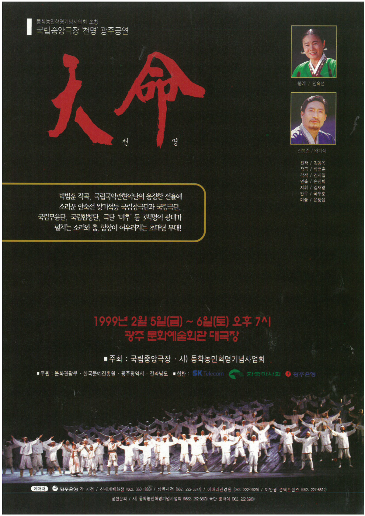 문) 동학농민혁명 백주년 기념사업 이후 전주기념사업회에서 아주 굵직한 사업들을 많이 전개하셨지요? 1999년 초에 동학농민혁명 대서사시 음악극 ‘천명’을 서울 국립중앙극장, 광주광역시 문화예술회관, 전북 전주시 삼성문화회관 등지를 순회하는 공연을 개최하여 대중적으로 동학농민혁명 역사인식을 높이는 데 기여하였지요? 그때 천명 출연진과 스텝이 거의 200여 명에 달하였다고 하던데, 그렇게 대규모 작품의 순회공연이 어떻게 가능하였는지요?