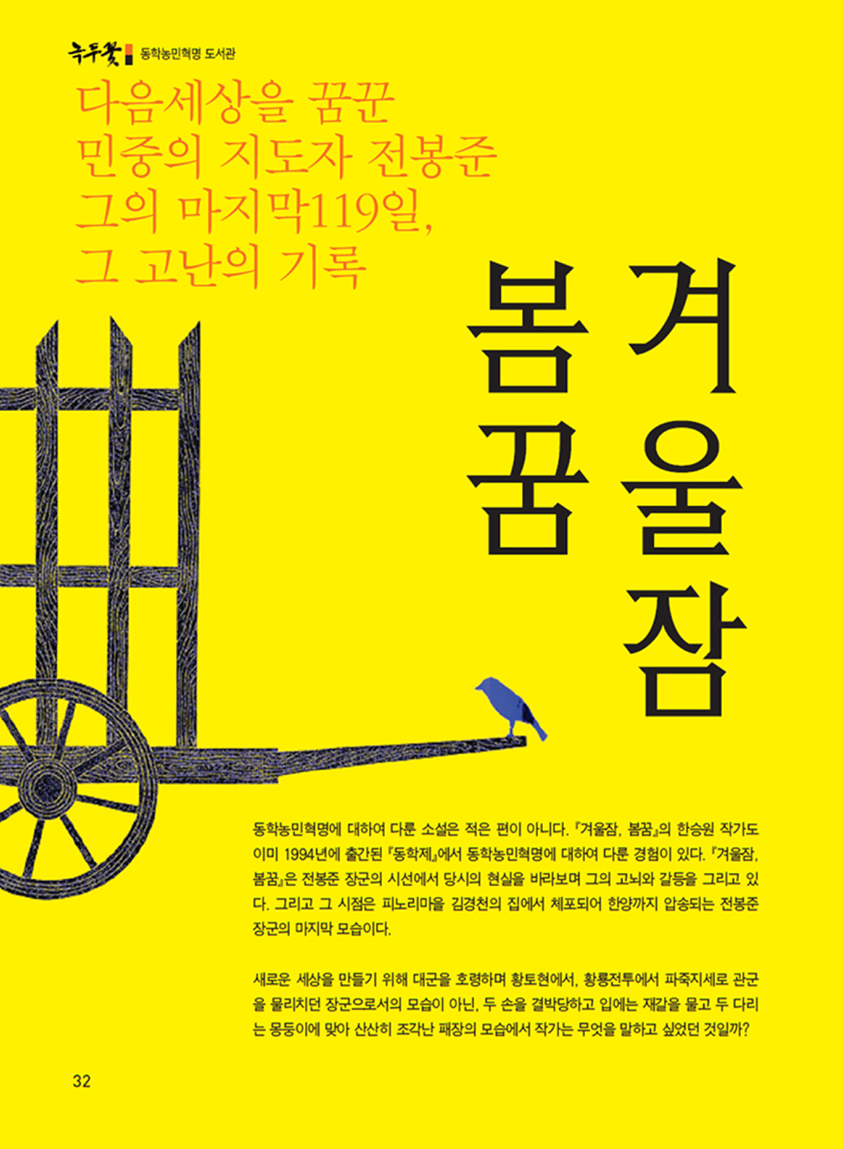 동학농민혁명에 대하여 다룬 소설은 적은 편이 아니다. 『겨울잠, 봄꿈』의 한승원 작가도 이미 1994년에 출간된 『동학제』에서 동학농민혁명에 대하여 다룬 경험이 있다. 『겨울잠, 봄꿈』은 전봉준 장군의 시선에서 당시의 현실을 바라보며 그의 고뇌와 갈등을 그리고 있다. 그리고 그 시점은 피노리마을 김경천의 집에서 체포되어 한양까지 압송되는 전봉준 장군의 마지막 모습이다.