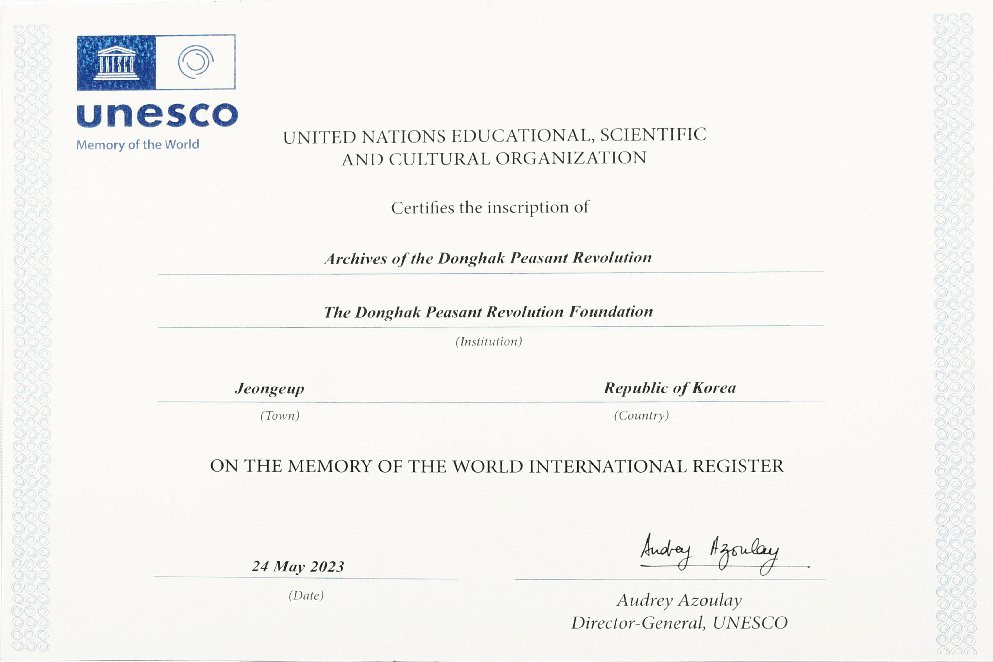유네스코 세계기록유산 등재 인증서