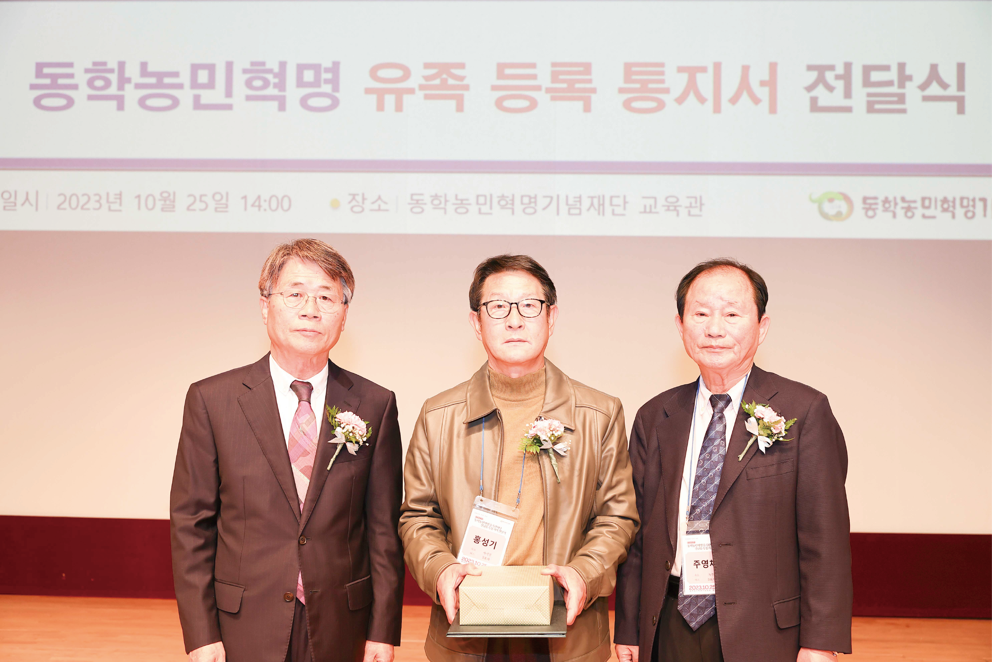 2023년 동학농민혁명 유족 등록 통지서 전달식(왼쪽부터 신순철 기념재단 이사장, 홍성기 유족, 주영채 전 유족회장)