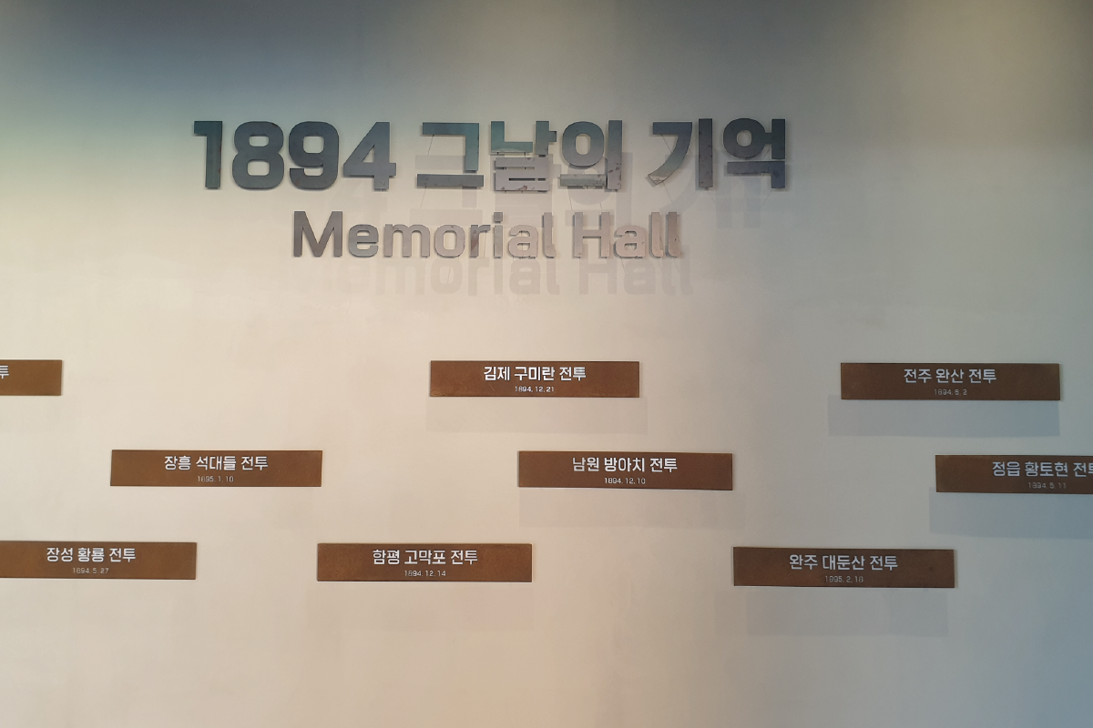 "1894년 그날의 기억", “넋이여, 갑오년의 꽃넋이여” 등의 주제어로 콘텐츠가 구성된 추모관은 복도와 추모관 내부로 나누어 구성되어 있다. 추모관으로 들어서는 입구에는 ‘1894년 그날의 기억’이라는 슬로건 아래 1894년 갑오년, 동학농민혁명 당시 전국 각 지역에서 벌어졌던 주요 전투지를 소개하고 있다.