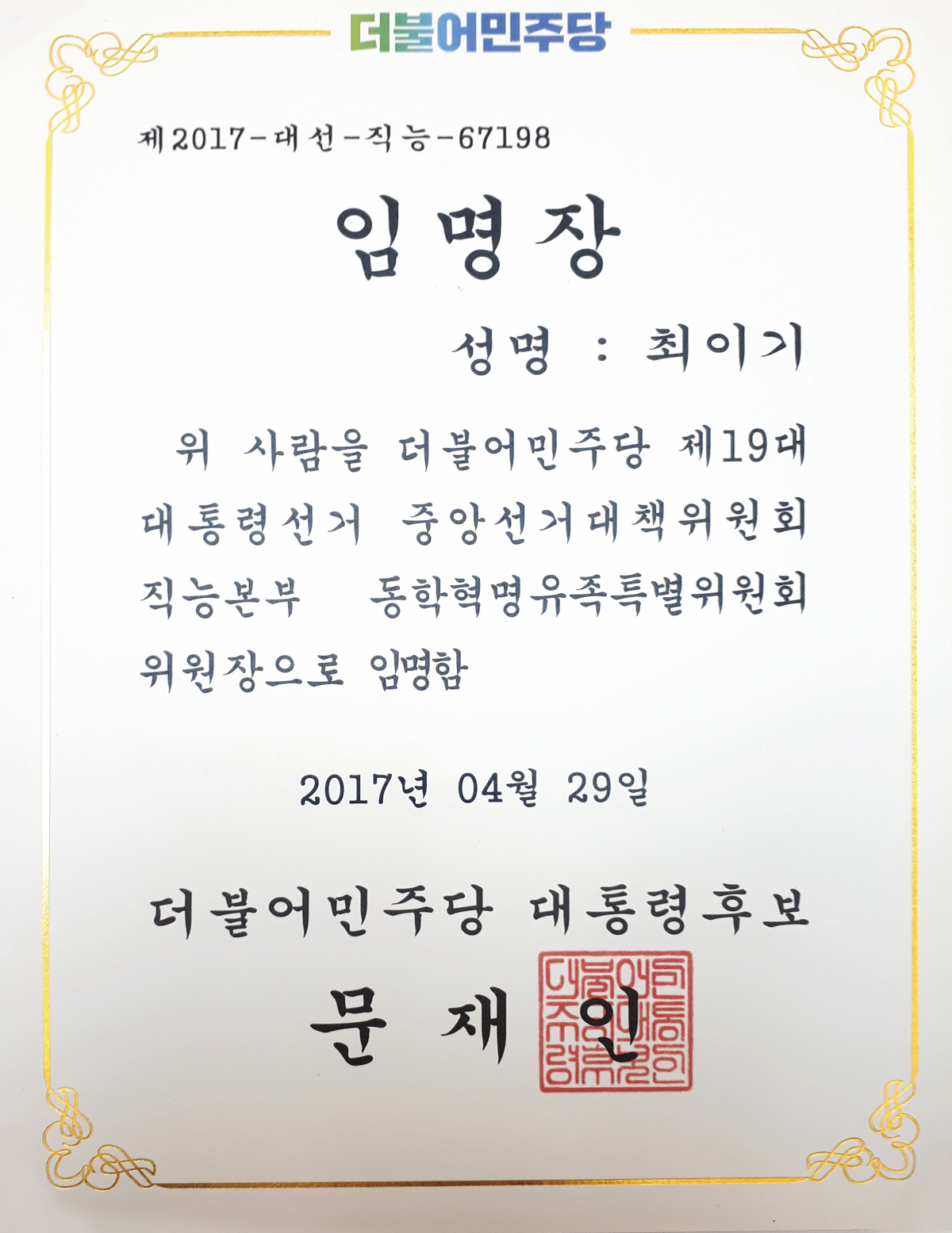 동학혁명유족특별위원회 위원장 임명장