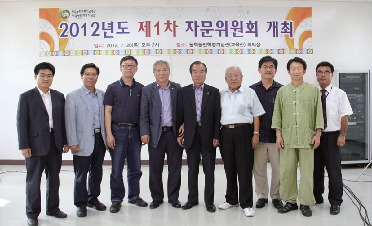 동학농민혁명관련 우리나라 제1의 대표시설로서 기념관의 효율적인 관리와 운영을 위해 각계의 전문가로 구성된 2012년도 동학농민혁명기념관 자문위원회가 지난 7월 26일 오후 2시 교육관 회의실에서 개최되었다. 김동길, 김종만, 송만오, 이기곤, 이병규, 이윤영, 하우봉 위원 등이 참석한 이날 자문위원회에서는 동학농민혁명기념재단 사무처장으로 기념관장직을 겸임하고 있는 이용이 위원이 자문위원장을 겸임하고, 이에 따라 위원별로 기념관의 학예와 운영에 대한 다양한 의견을 제시하였다. 특히 자문위원들은 기념관활성화를 위한 발전방안으로 기념관의 리모델링 추진에 대해 공감하고, 문화체육관광부와 전라북도의 관심과 지원을 적극 요청할 것을 강조하였다.