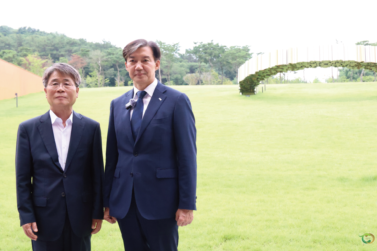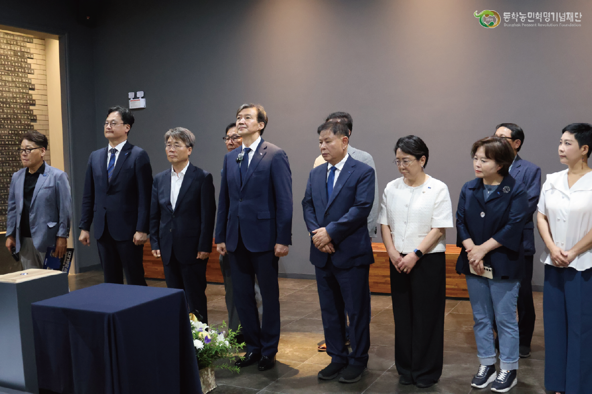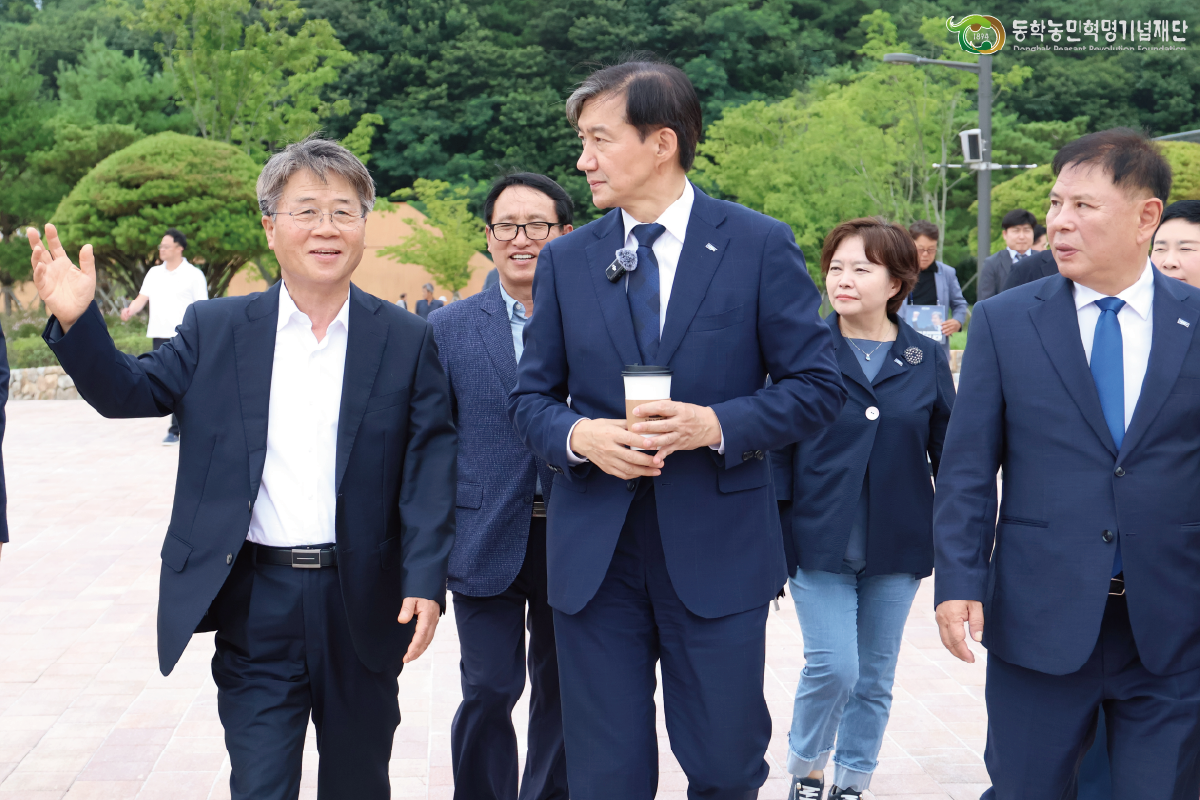 지난 7월 13일 조국혁신당(대표: 조국) 대표를 비롯하여 소속 국회의원, 조국혁신당 전북특별자치도당 관계자 등이 기념공원을 방문하였다. 일행은 동학농민혁명기념재단 신순철 이사장 안내로 동학농민혁명 참여자 3,800여 명의 명패를 모신 추모관을 찾아 참배하였다. 이어서 동학농민혁명의 동아시아·세계사적 위상과 의미는 물론이고, 우리나라 근·현대사의 극심한 부침으로 왜곡·축소되는 과정에서 참여자의 유족들이 겪은 고난의 삶을 엿볼 수 있는 전시관을 둘러보았다. 이어 기념공원 일대를 답사하였는데, 추모관과 전시관 중간지점 잔디밭에 설치된 상징조형물 ‘죽창결의’에 각별한 관심을 보였다.