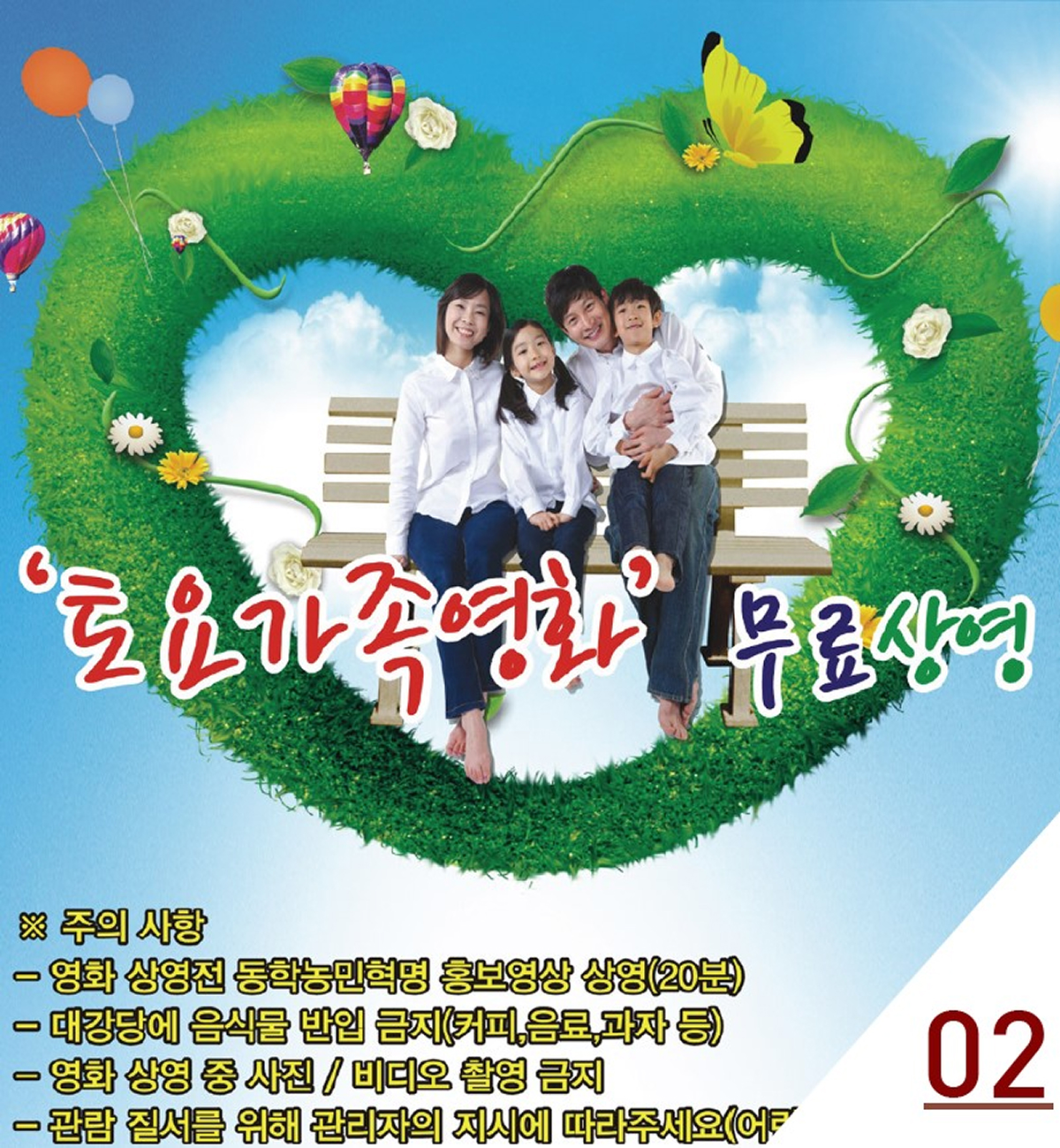토요가족영화는 유치원생・초등학생 가족과 일반인 가족을 대상으로 동학농민혁명에 대한 관심을 유도하고, 지역민들에게 문화향유의 기회제공을 목적으로 기획되었다.